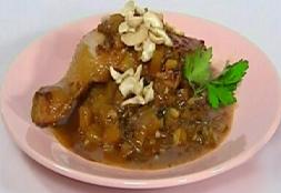 تسكب قطع الدجاج و تصب فوقها الصلصة تزين بالكاجو و تقدم