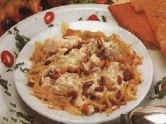يضاف البصل والسمك إلى الصلصة ويخلط برفق مع ترك شريحة سمك للزينة