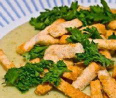 ثم تزين شوربة البطاطا بالبقدونس و البطاطا والبندورة والتوست