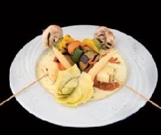 توضع الصلصة في طبق التقديم، يعلوها شيش الخضر المشوية