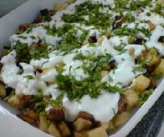 ثم نضع البطاطا المقلية طبقة ثانية فوق الباذنجان وفوقه الحمص والخبز المقلي