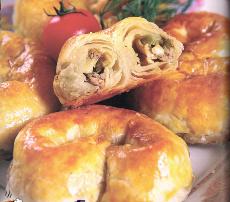 نأخذ قطع العجين، نرش عليها القليل من الطحين ونفردها قليلاً ثم نضيف إليها القليل من الحشوة بحيث تغطي العجين