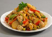 يتم تسخين الزيت إلى درجة عالية الحرارة ,ثم يضاف الزنجبيل و الثوم و الدجاج ,مع استمرار تقليب المقادير حتى يتغير لون قطع الدجاج و تبدأ في النضج