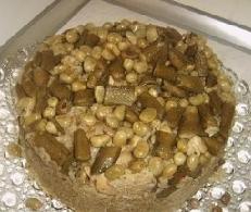 نسلق الدجاج حتى ينضج ثم نقليه في زيت حار ثم نقلي الفول الأخضر