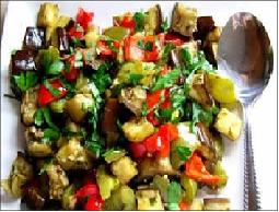 نشوي الباذنجان ونرفع عنه القشرة، ثم نقطع حبات الفليفلة قطعا صغيرة وكذلك نقطع البصل الأخضر ونفرم البندورة قطعا صغيرة ثم نضيف حبة الثوم