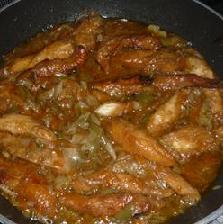 أخيراً تضاف أصابع الدجاج المقلية، يوضع القليل من الماء لتغلي مع بعض وليتكون صوص ثقيل، وتقدم ساخنة