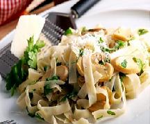 يقلى الثوم مع الزبدة و قليل من الزيت في مقلاة كبيرة ثم يضاف الفطر و الفوتشيني و البقدونس