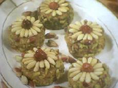رمدي الحواف بالفستق المكسر ضعي حبة بندق في الوسط واحيطيها بالصنوبر