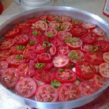 تصف كل من شرائح البطاطا والطماطم على شكل طبقات فوق اللحمة، ثم توضع السمنة على شرائح الطماطم ويسكب الماء فوق الصينية ثم تدخل إلى الفرن على درجة حرارة 140 درجة مئوية لمدة ساعة أو حتى النضج