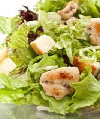 في صحن التقديم ضعي أوراق الخس ثم الخبز المقلي وأخيراً مكعبات الدجاج وقدميها