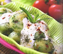 ثم نصف الكريات في طبق التقديم ، و نضيف فوقها مزيج اللبن والثوم
