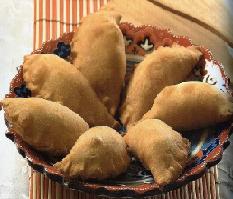 تبلل أطراف الدائرة بقليل من الماء ويوضع في الوسط مقدار من الحشوة وتلف العجينة بشكل نصف دائرة مع الضغط على الأطراف باستخدام الشوكة أو أداة ( كبس العجين)