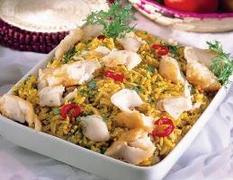 عند التقديم يسكب الأرز ويوضع عليه قطع السمك والبصل المحمر والصنوبر ويقدم مع صلصة الصيادية
