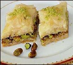 ثم يعاد رص الرقائق فوق الفستق مع مسح كل منها بالزبدة ثم نقسمها على شكل معين بسكين حادة