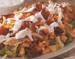 نصف أوراق الخس المفروم أولاً في قعر طبق التقديم ونضع فوقها نصف كمية الباذنجان والقليل من مزيج البصل و نضع طبقة البطاطا وبعدها طبقة من الذرة (يمكن توزيع قطع الخبز المقلية فوق كل طبقة) ومن ثم توزيع ما تبقى منها على السلطة نسكب الصلصة فوق السلطة ونقدمها