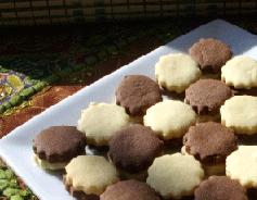 نلصق واحدة من اللون الأسود مع أخرى بيضاء بالشوكولا المذابة وتقدم