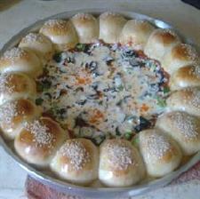 توضع الحشوة في الوسط، نضع عليها الزيتون الأسود المقطع وفلفل أخضر مقطع شرائح، تدهن كرات الكيري بالبيضة والحليب من أجل اللمعة،نضع عليها القليل من السمسم الأبيض