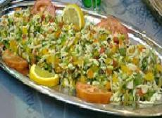 تخلط المعكرونة مع الخضروات المقطعة ثم تضاف التتبيلة وهي(ليمون وملح وفلفل أسود وزيت زيتون ونعناع مجفف وسماق)