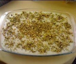 بعد أن يبرد قليلا نفرد القشطة فوقه ثم نرش الفستق الحلبي ونضعها في الثلاجة
