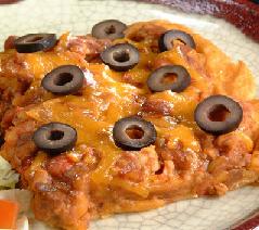في وعاء آخر يسخن الزيت على درجة حرارة متوسطة ويضاف له الدجاج والبصل والفلفل البارد ويطهى إلى أن يذبل البصل والفلفل ويضاف له الفاصوليا و النصف الثاني من مكعب الدجاج وصلصة الطماطم والماء إلى أن تتخلله الحرارة ويضاف على عجينة البطاطا وتخبز بالفرن لمده 30 دقيقة وتزين بالخس والجبن والزيتون حسب الذوق