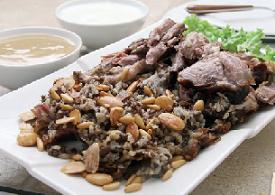 يصفى الأرز المغسول والمنقوع في ماء فاتر ويضاف إلى اللحمة ويقلب حتى يمتص الماء