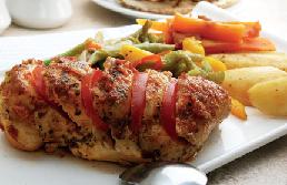 تدهن صدور الدجاج بالزيت ويرش عليها الأوريغانو ثم تصف في طبق زجاجي مقاوم للحرارة فيه البندورة المفرومة المخلوطة مع الملح والأوريغانو