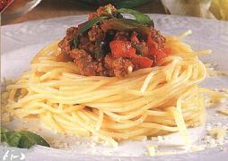 تصف أعشاش المعكرونة في صينية التقديم وتغطى بحشوة اللحمة