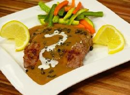 عند استواء اللحم يسكب في طبق التقديم و يوضع مقدار كوب من الصلصة على الوجه ثم نوزع حبات الفلفل