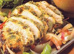 أحضري طبق التقديم وضعي شرائح البصل والفلفل في الطبق، أخرجي الدجاج المشوي من الفرن وقطعيه إلى شرائح رقيقة ثم ضعيه فوق طبقة البصل والفلفل