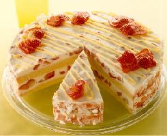 يقسم قالب الكيك إلى نصفين بعد أن يبرد ويسقى النصف الأول بنصف كمية شراب الفراولة، ويغطى بربع كمية الكريمة المخفوقة وترتب الفراولة المقطعة فوق الكريمة