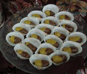 نأخذ قطعة من كل عجينة ونلصقها مع بعض وتشكل مثل التمرة ونضع على رأسها حبة قرنفل