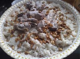 يتم فرد الأرز على الخبز ويتم توزيع اللحم فوق الأرز (يجب أن يكون اللحم ناضجا جدا)