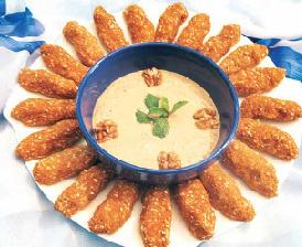 نحضر صحن التقديم ونضع في وسطه صحن الصلصة، ثم نرتب حبات البرغل على أطرافه
