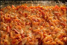 يحضر البشاميل، تدهن الصينية بالزيت وتوضع المعكرونة المسلوقة وتفرد في الصينية ويوضع عليها شرائح البندورة والفلفل الأخضر والزيتون