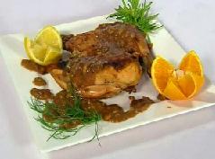 تخرج قطعة الدجاج و تسكب و تقدم في طبق التقديم و تسكب فوقها الصلصة