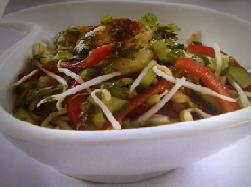 تسكب السلطة في طبق التقديم ثم تزين بالربيان وترش بالسمسم مع زيت الزيتون