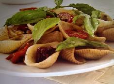 تخلط المعكرونة مع البندورة المشوية والجرجير وتقدم