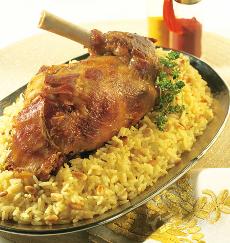 نفرش الأرز فوق طبق التقديم ونزينه بكتف الخروف المحشي دون أن ننسى نزع الخيط