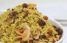 يوضع الأرز في طبق التقديم ويرش فوقه اللوز المقلي