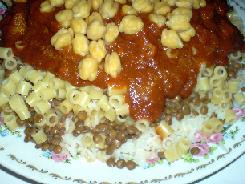 نقدم الطبق العدس و الأرز و نضيف المعكرونة و نضع الصلصة و يجمل بالبصل المقلي