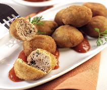 نشكّل من الخلطة كريّات ذات حجم معتدل ونغطسها في الطحين ثمّ البيض وأخيرا الكعك ، نقلّي الكرات في زيت ساخن، نصفيها ونقدّمها مصحوبة بصلصة البندورة بالحبق