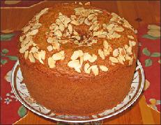 ندهن القالب بالزبدة ثم نصب العجين نرشه برقائق اللوز وندخله للفرن حتى ينضج