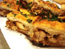 نضع طبقه توست ثانية على الصينية ثم نصب الخلطة عليها ونرشها بالبقدونس