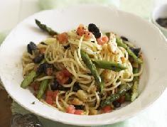 في صينية الخبز، تضاف المعكرونة والهليون وخليط الزيتون والبندورة، وتوضع فتات الخبز على الوجه يتم إدخالها إلى الفرن لمدة دقيقة، وتزيّن بجبنة بارميزان