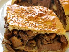 يُدهن سطح الفطيرة بخليط صفار البيض المخفوق مع الحليب، ويتم عمل خطوط مائلة متقاطعة باستخدام طرف سكين حاد، للتزيين (مع مراعاة عدم تقطيع العجين)