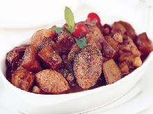تضاف كمية كافية من الماء الساخن لغمر اللحم ثم يطهى المزيج على النار حتى ينضج اللحم