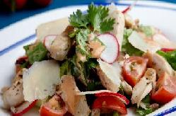 تفرد جميع الخضروات الورقية ” الخس الأحمر والبلدي” مع حلقات الفجل والبندورة الصغيرة في الطبق وضعي فوقها قطع الدجاج الساخنة وترص حولها شرائح جبن البارميزان ، ثم وزعي فوقها قطرات من متبل صوص السلطة يزين الطبق النهائي بأوراق الكزبرة الطازجة، وتقدم السلطة دافئة