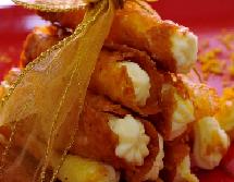 يُخبز البسكويت في الفرن لمدة 7 إلى 8 دقائق، ثم يُلف على شكل أسطوانة وهو دافئ، ويُترك ليبرد