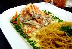عند استواء الدجاج يسكب ويقدم مع الخضار مع سكب الصلصة على الوجه ويقدم مع الأرز أو الباستا أو البطاطا المقلية