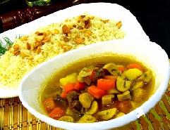 تضاف اللحمة ونتابع التحريك مدة 3 دقائق بعد ذلك يضاف الجزر مع التقليب ثم يضاف مرق اللحم ويترك للغليان مدة 4 دقائق